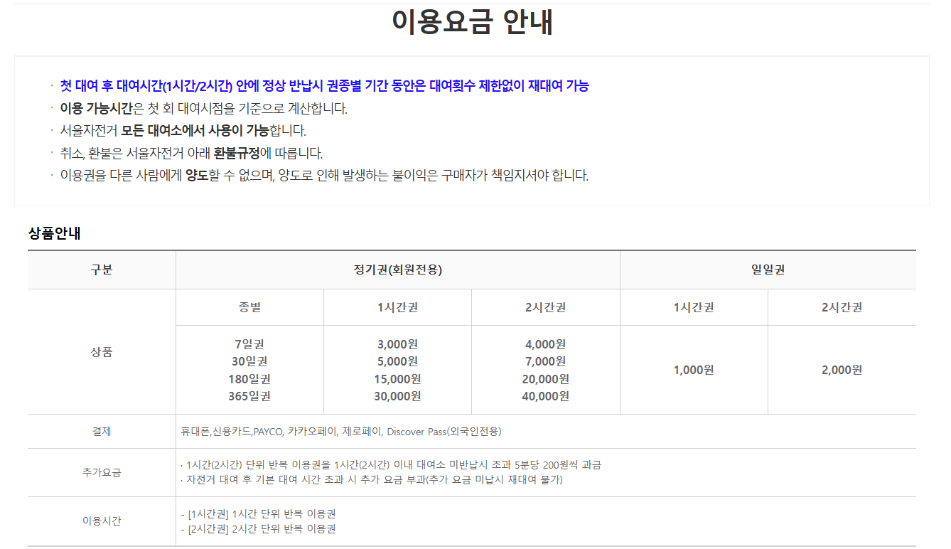 따릉이는 다양한 상품을 보유하고 있는데요, 따릉이 홈페이지에 나와있는 요금은 다음과 같아요.