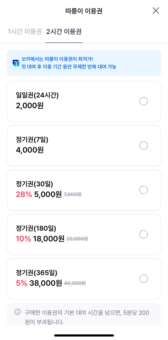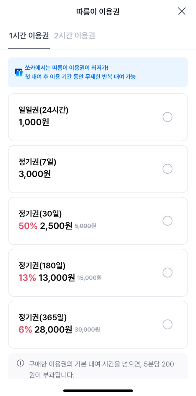 보통 일일권인 1시간권(1000원)을 많이 사용하는데, 이용하는 횟수가 많다면 정기권(7일,30일,180일,365일)도 추천할 수 있는 상품입니다. 자전거가 너무 좋은 이동 수단이지만, 날씨의 영향이라는 변수는 피해갈 수 없어서 정기권을 고민하고 있었는데 이번에 쏘가에서 따릉이 50% 할인을 시행 중이어서 이용해보기로 했습니다.