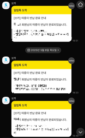 다만, 반납을 할 때 따릉이에서는 반납이 완료됐다고 음성이 들리는데, 쏘카 알림톡이 안(늦게) 오는 경우를 경험했습니다.