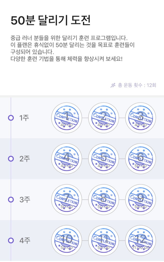 런데이 프로그램에서도 볼 수 있듯이 회차가 진행 될 수록 반복 횟수를 늘리면서 운동 강도를 조절하는 것을 알 수 있었어요. 훈련이란 게 익숙해지면 변화를 줘야 한다는 것을 깨달을 수 있네요..
