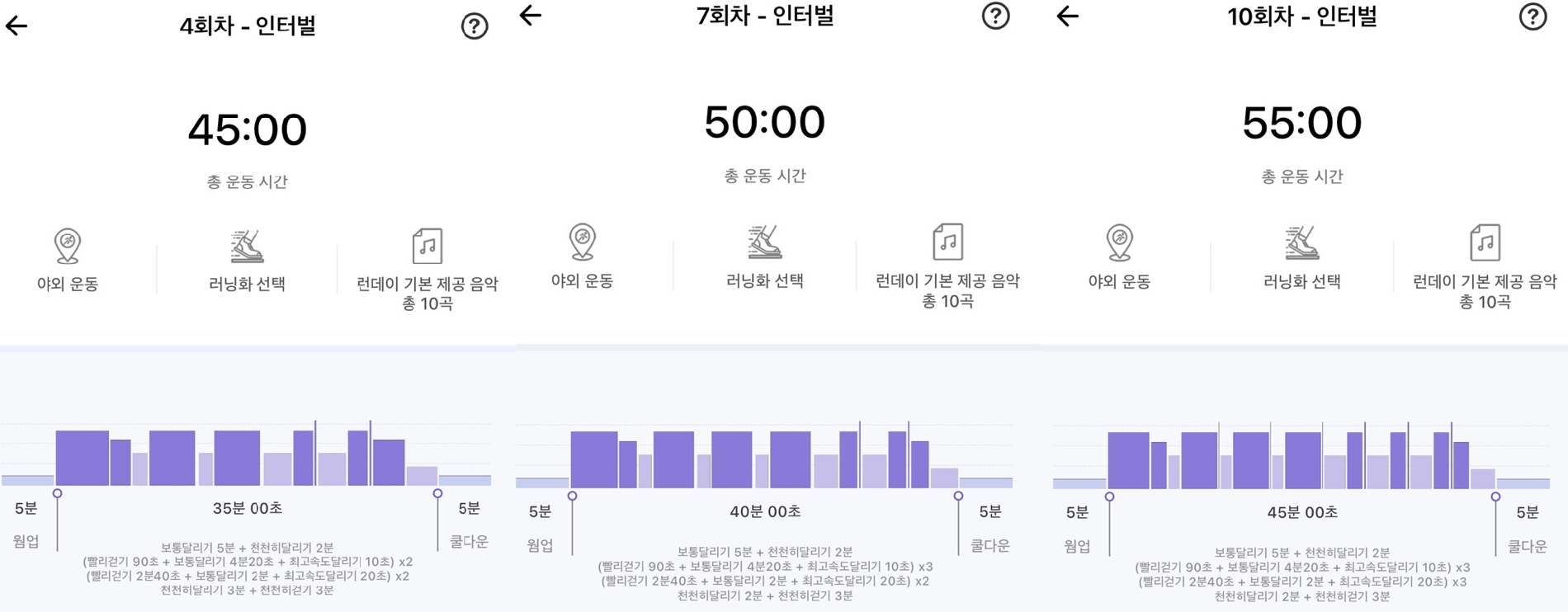 초보자 분들은 30초 달리기 + 1분 걷기를 체력에 따라 8-10세트 정도 진행하는 것을 추천드려요.