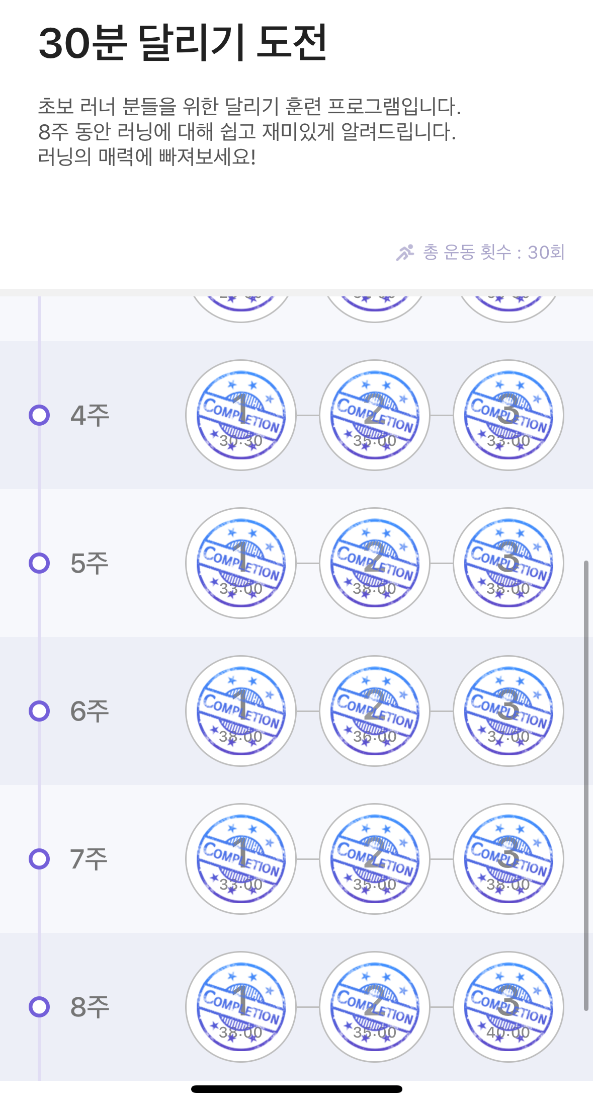 지인에게 런데이 어플을 추천받아 고등학교 체력장 이후에 달리기라는 동작을 해본 적이 없을 정도로 낯설었던 동작을 해봤었거든요. 30분 달리기 도전을 완성하고 뭔가 모를 뿌듯함을 느꼈지만 허리가 뻐근한 느낌이 들어서 30분 달리기 도전만 마무리 짓고 달리기를 하는 것에 대해 막연한 두려움을 가지고 있었어요.